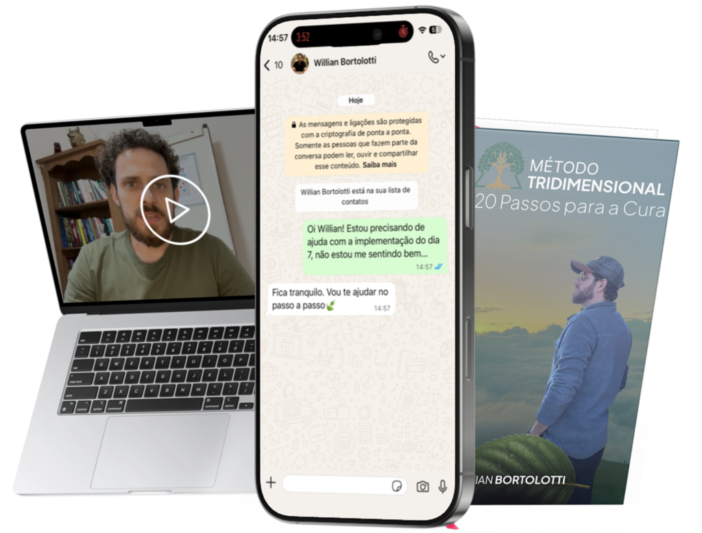 O primeiro acompanhamento diário via WhatsApp desenhado para quem não tem forças para começar. Pare de lutar sozinho contra a inércia e use a ciência do Método Tridimensional para reconstruir sua vida de dentro para fora.